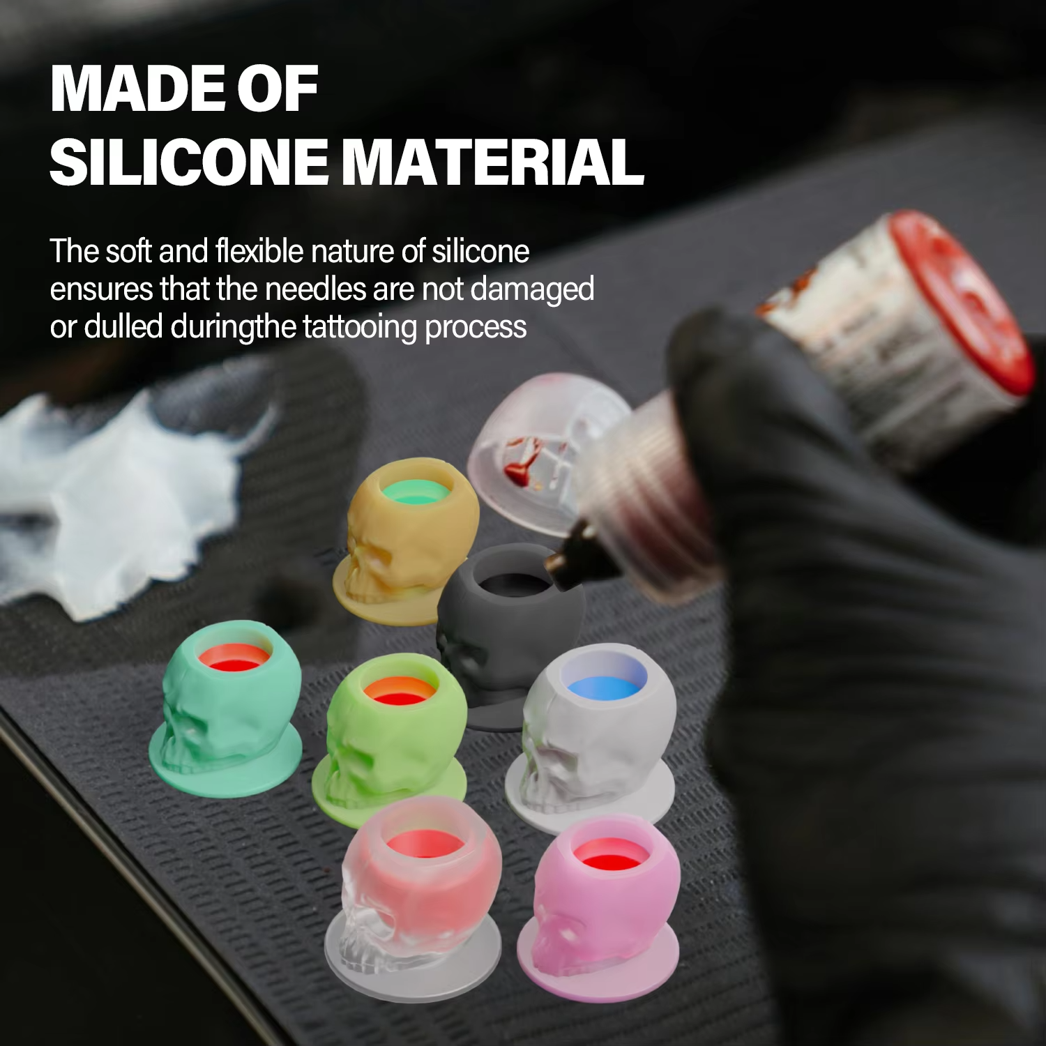 High-quality silicone skull-shaped tattoo ink cups, designed for durability and precision. Protects needles and adds style to your tattoo kit.