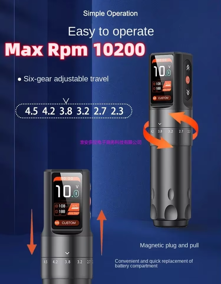 Wireless tattoo pen with 2000mAh battery, adjustable stroke (2.3 – 4.5mm), clear digital display, and ergonomic grip for precise, long-lasting tattooing.